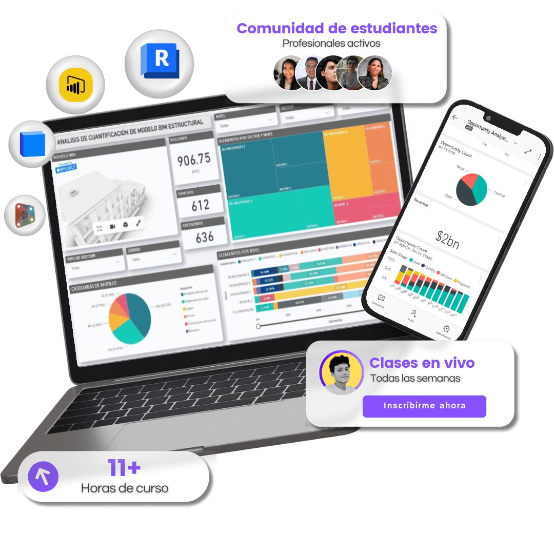 Este es un programa COMPLETO sobre laintegración de Revit con Power BI para que domines la creación de dashboards BIM con objetos visuales 3D. Aprenderás a conectar de manera fluida tus proyectos BIM con análisis avanzados, logrando un mejor control y visualmente impactante sobre tus datos de proyecto.